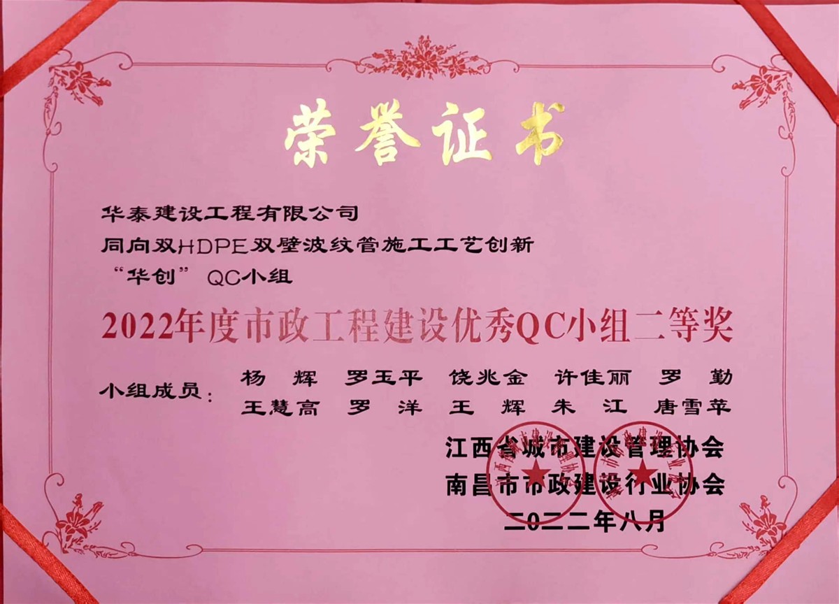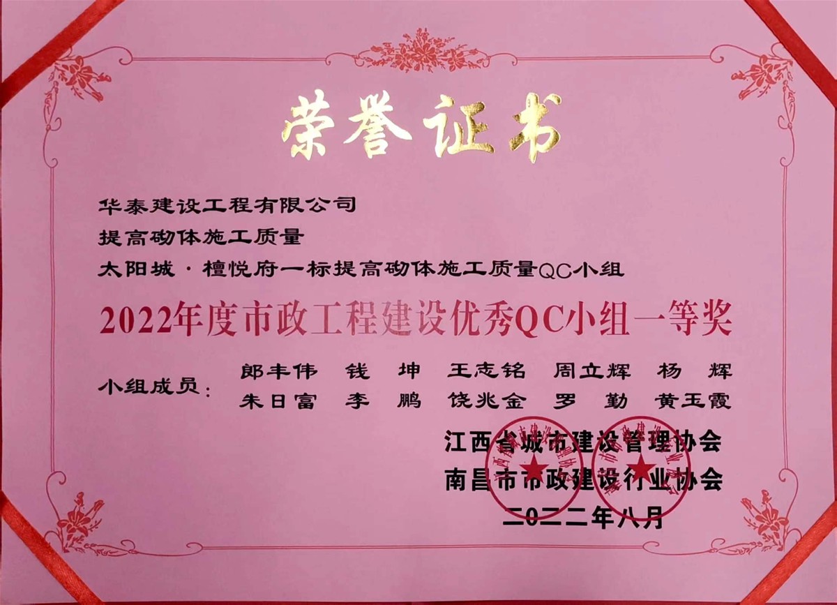 金秋九月,華泰建設(shè)太陽城·檀悅府一標(biāo)QC小組榮獲2022年度江西省市政工程建設(shè)優(yōu)秀質(zhì)量管理小組活動一等獎,南水中央QC小組及“華創(chuàng)”QC小組榮獲二等獎。